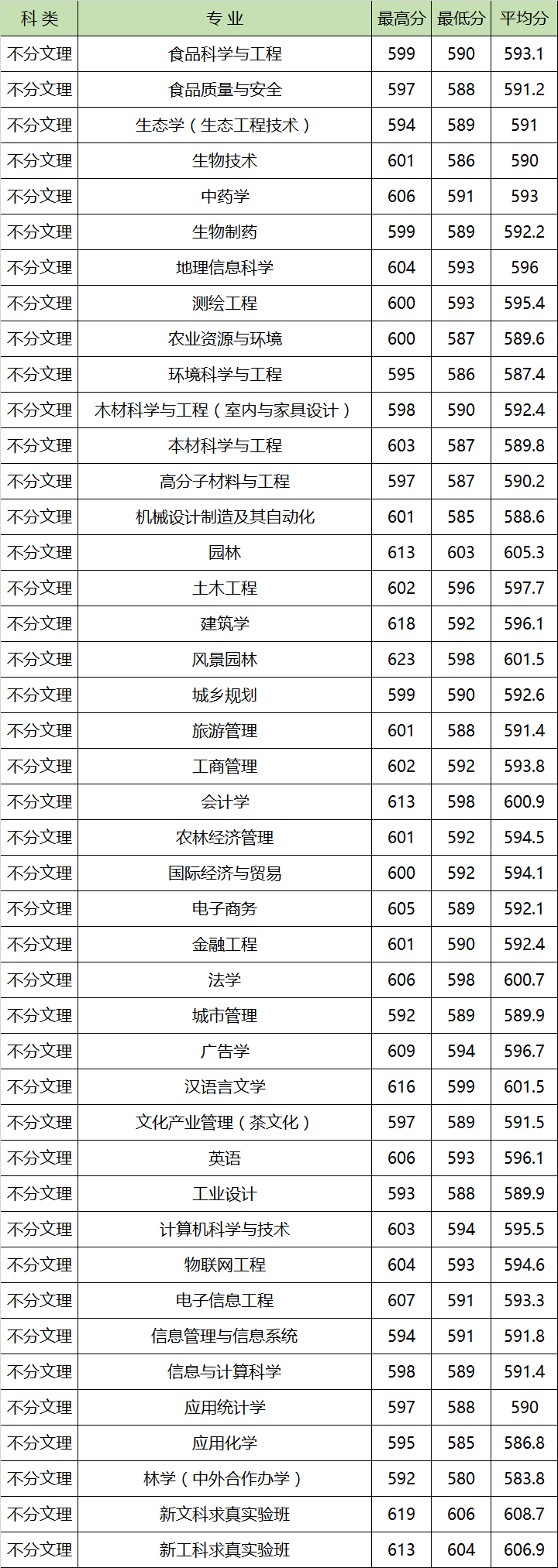 浙江农林大学2019年在浙江省收分最高的专业为风景园林,最高分为623分,最低分为598分;收分最低的专业为机械设计制造及其自动化,最高分为601分,最低分为585分。