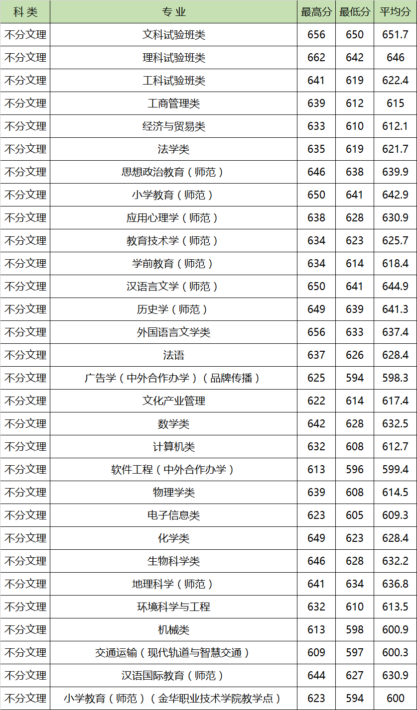 浙江师范大学2019年在浙江省收分最高的专业为理科试验班类,最高分为662分,最低分为642分;收分最低的专业为小学教育(师范)(金华职业技术学院教学点),最高分为623分,最低分为594分。