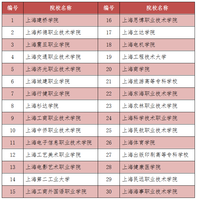 2020年3月23日,上海市教育委员会公布了上海市30所试点院校参加专科层次依法自主招生的招生章程。其中,包括了上海剑桥学院、上海邦德职业技术学院等高职专科院校。具体学校名单如下,供参考: