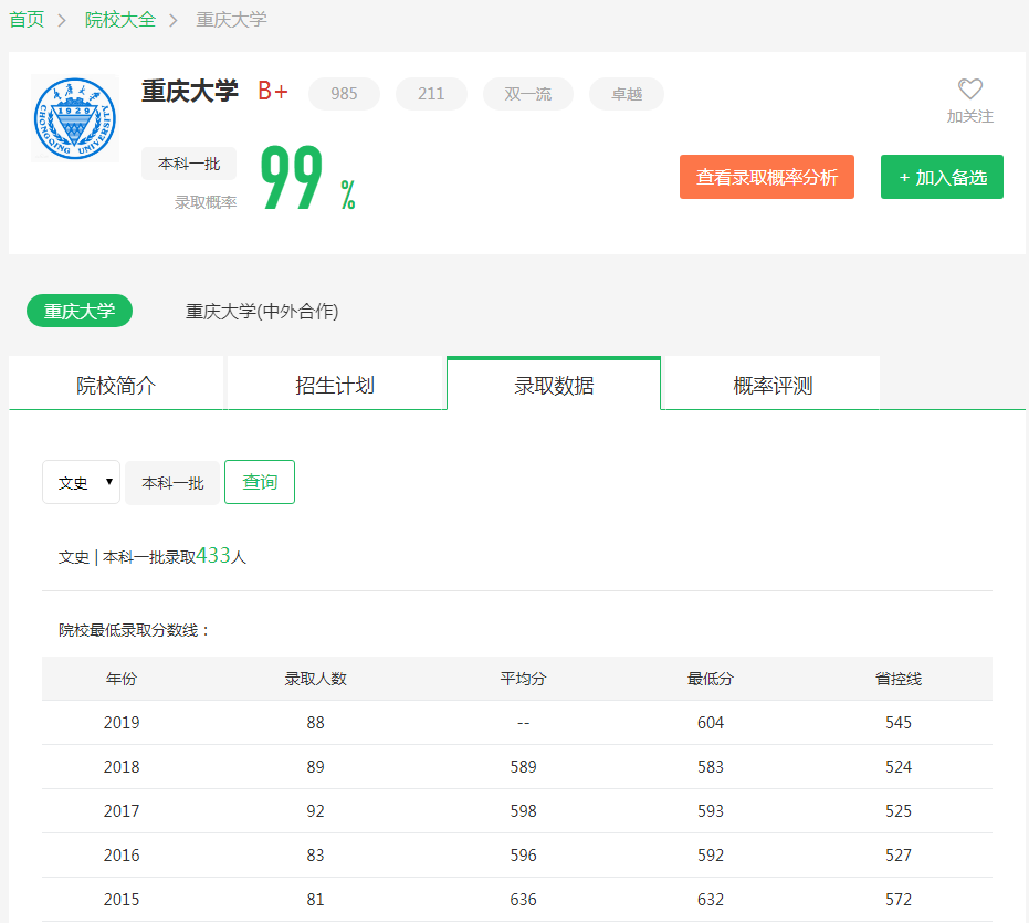 根据圆梦志愿及重庆大学官网公布的招生录取数据可知: