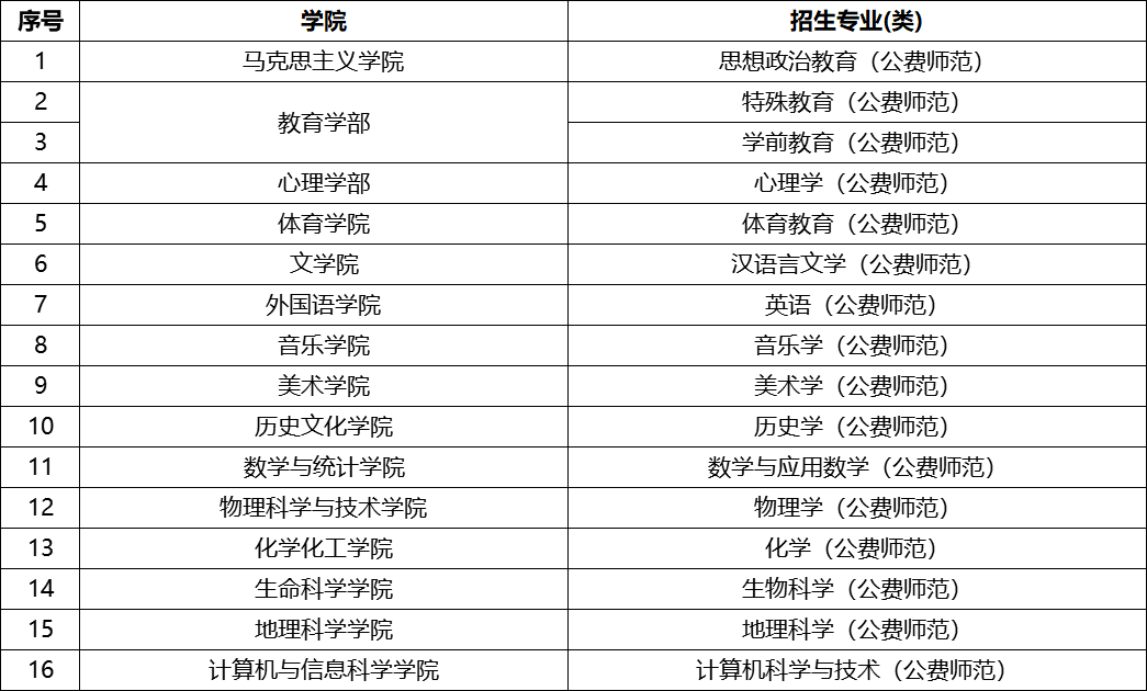 思想政治教育、特殊教育、学前教育、心理学、体育教育、汉语言文学、英语、音乐学、美术学、历史学、数学与应用数学、物理学、化学、生物科学、地理科学、计算机科学与技术。
