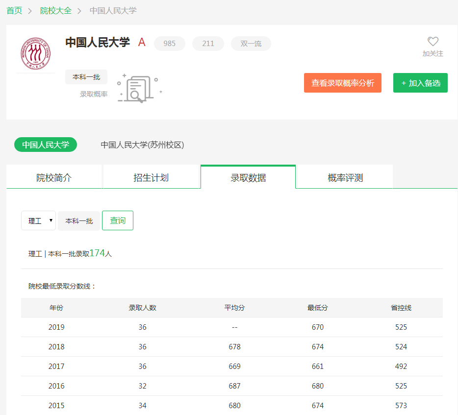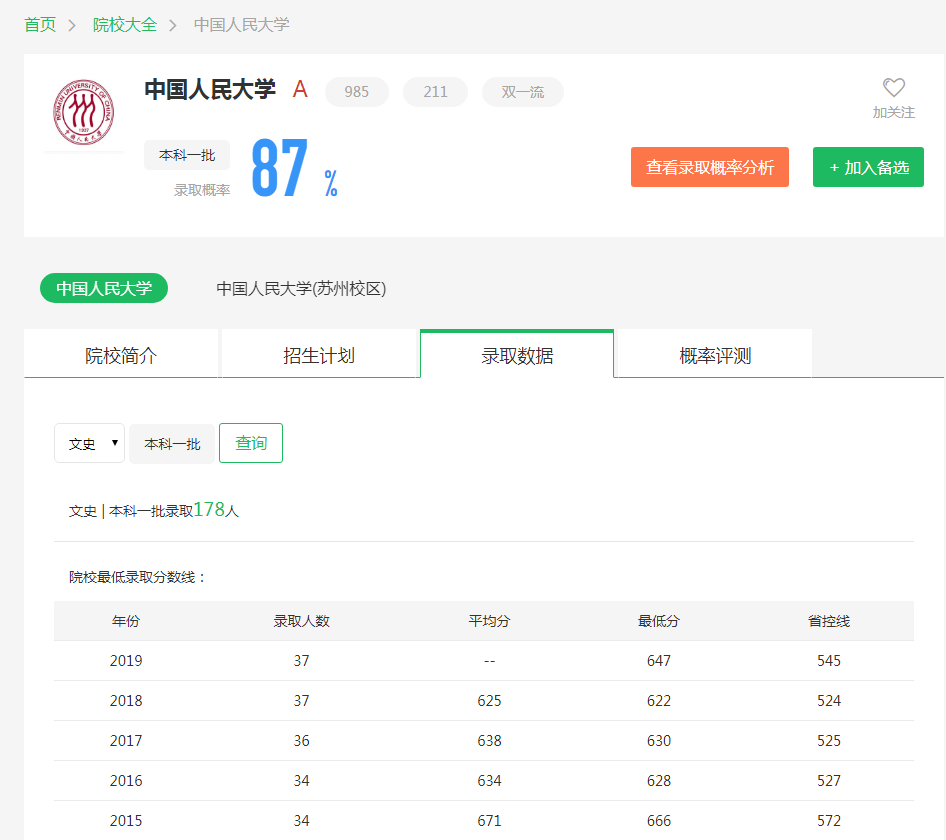 根据圆梦志愿及中国人民大学官网公布的招生录取数据可知: