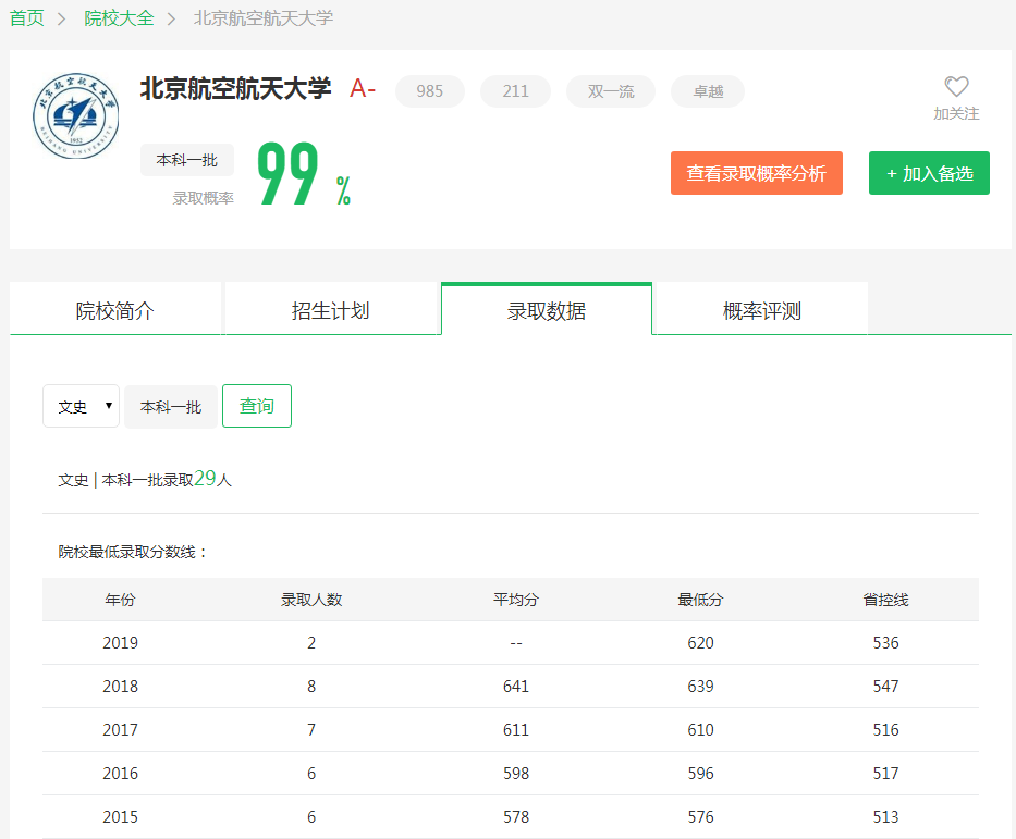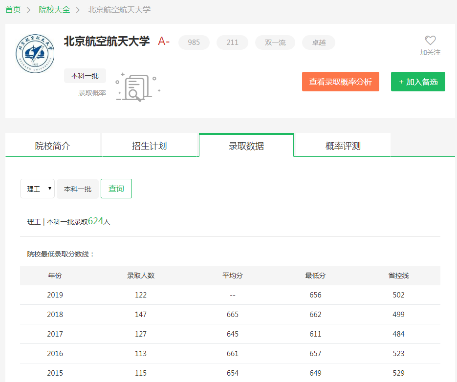 根据圆梦志愿及北京航空航天大学官网公布的招生录取数据可知: