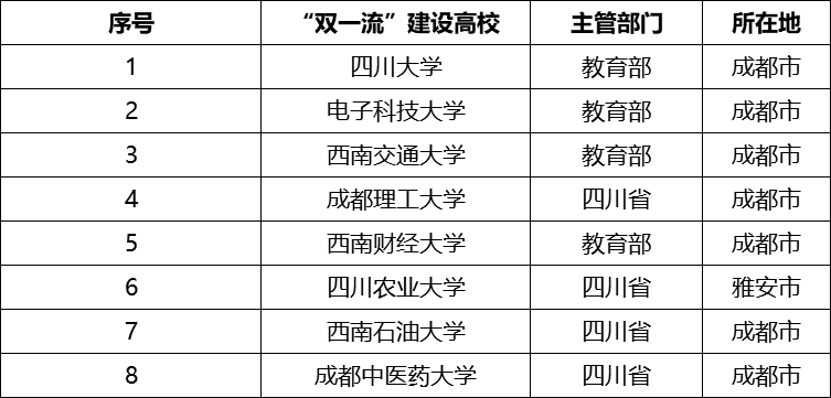 四川目前共有8所大学入选“双一流”建设高校名单。其中,四川大学和电子科技大学为四川省仅有的两所世界一流大学建设高校(即“双一流”大学);其余高校均为世界一流学科建设高校(即“双一流”学科大学)。地理位置上,这8所高校为4所部属高校,4所省属高校;并且,8所高校中7所位于成都,仅四川农业大学在雅安。具体名单如下,可供参考:
