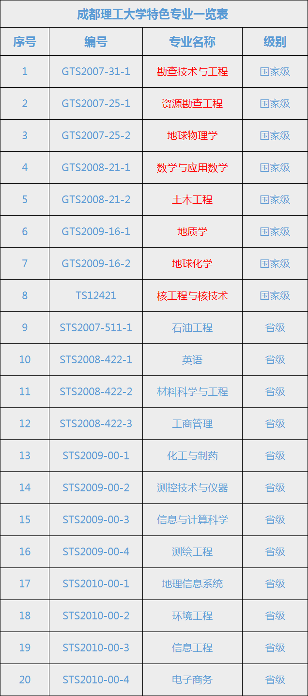 根据成都理工大学学校官网公布信息可知,学校目前共有8个国家级特色专业,分别是:勘查技术与工程、资源勘查工程、地球物理学、数学与应用数学、土木工程、地质学、地球化学、核工程与核技术