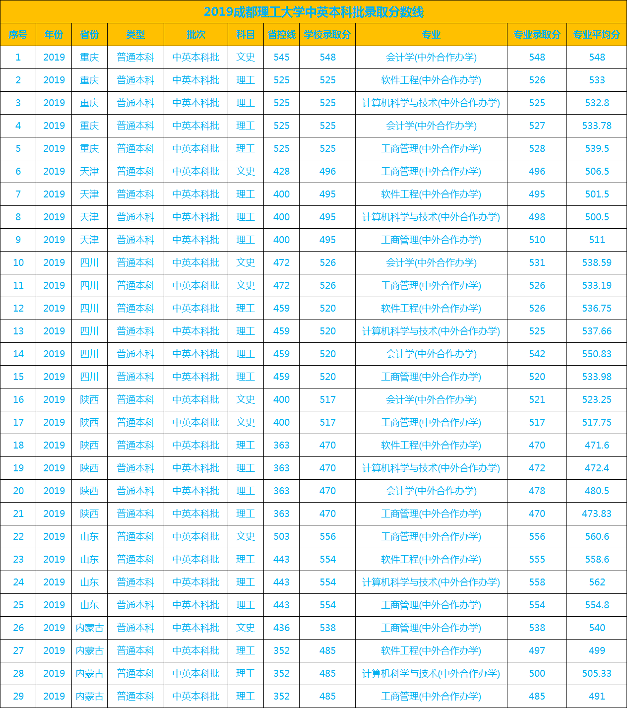 由学校官网公布信息可知,成都理工大学2019年在重庆、天津、四川、陕西、山东、内蒙古等6个省市招收会计学(中外合作办学)、软件工程(中外合作办学)、计算机科学与技术(中外合作办学)、工商管理(中外合作办学)等4个专业。