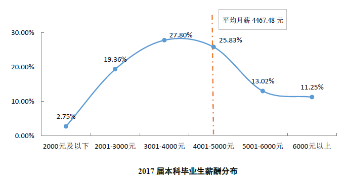 成都理工大学2017届本科毕业生的平均薪资为4467.48元/月(占比25.83%),毕业生薪资主要集中在3001-4000元之间(占比27.80%)。