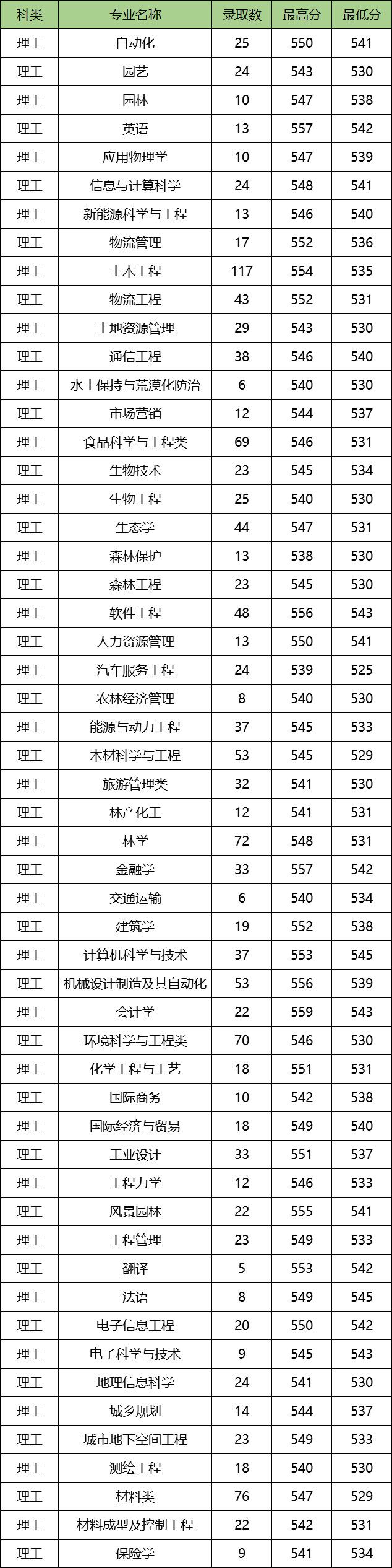 中南林业科技大学理科收分最高的是会计学专业,其录取的最高分为559分,最低分为543分;理科收分最低的是汽车服务工程专业,其录取的最高分为539分,最低分为525分。