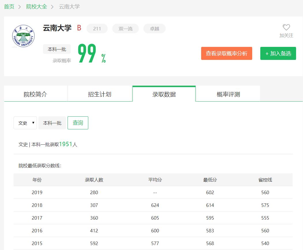 根据圆梦志愿及云南大学官网公布的招生录取数据可知:
