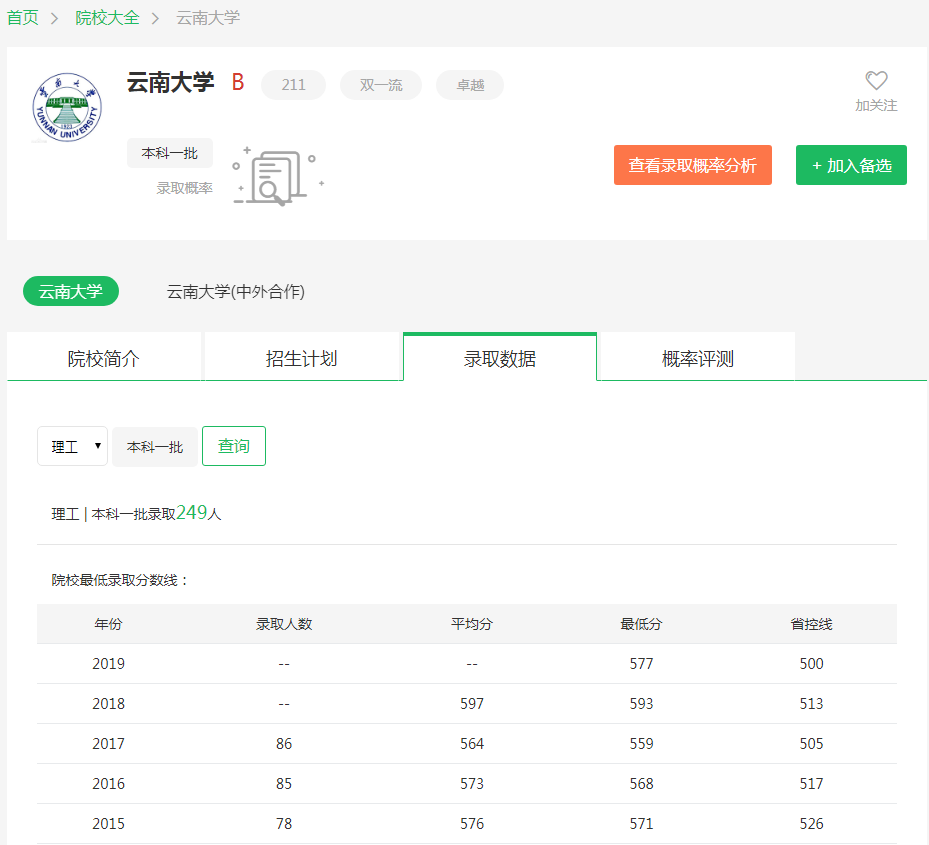 根据圆梦志愿及云南大学官网公布的招生录取数据可知: