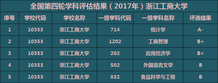 在全国第四轮学科评估中,浙江工商大学的统计学学科获得A-的优秀成绩,工商管理和应用经济学学科获得了B+的成绩,学校的外国语言文学和食品科学与工程学科获得了B的成绩。