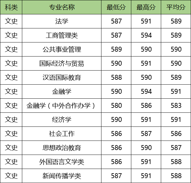 其中,文科收分最高的是金融学专业,其录取的最高分为594分,最低分为590分;文科收分最低的是社会工作专业(不包含单列专业及中外合作专业),其录取的最高分为586分,最低分为587分。