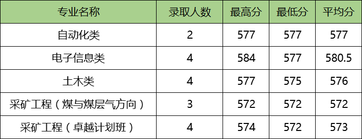 其中,一本理科收分最高的是电子信息类专业,其录取的最高分为584分,最低分为577分;文科收分最低的是采矿工程(煤与煤层气方向)专业,其录取的最高分最低分均为572分。