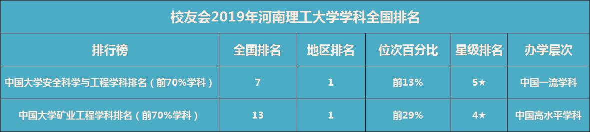 在校友会公布的2019中国学科排名中,河南理工大学的安全科学与工程学科名次较高,在全国高校中位列第7。学校的矿业工程学科也取得相对不错的成绩,在全国高校中位列第13。