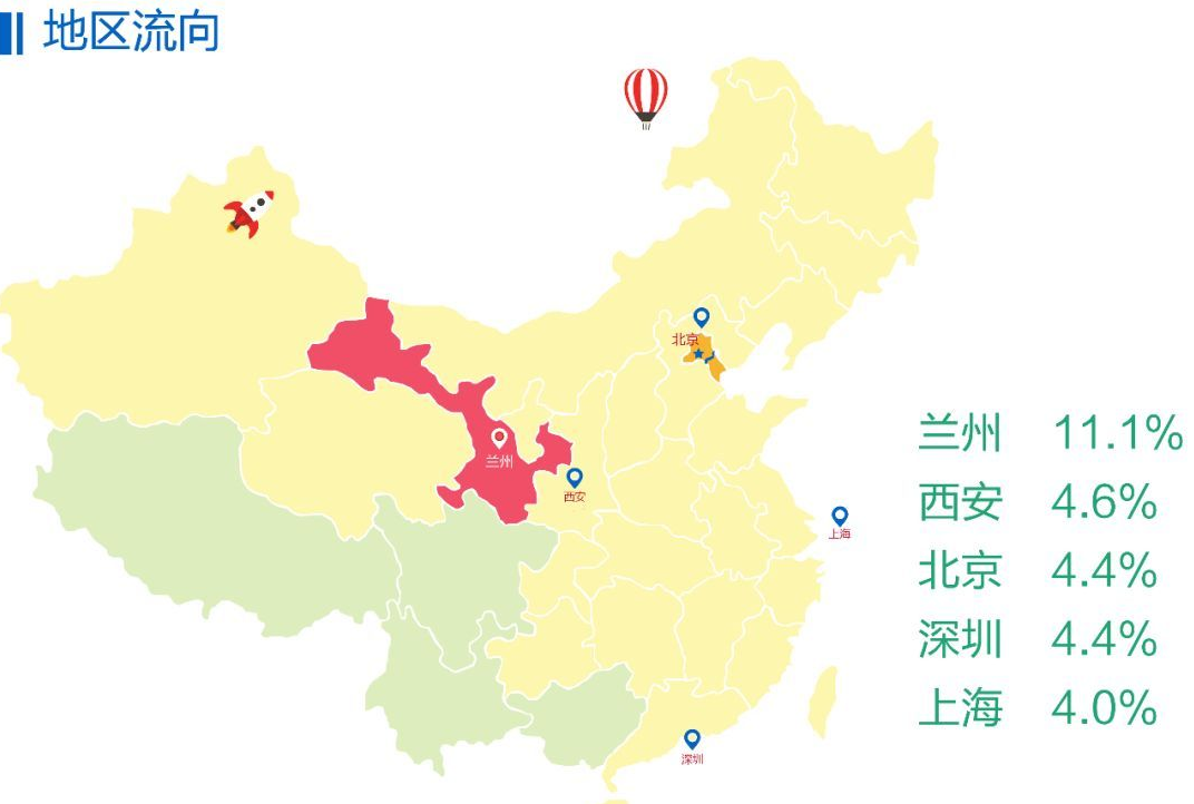 有20.3%的毕业生选择留在甘肃省就业,但绝大多数学生选择在其他省市就业,占比79.7%。