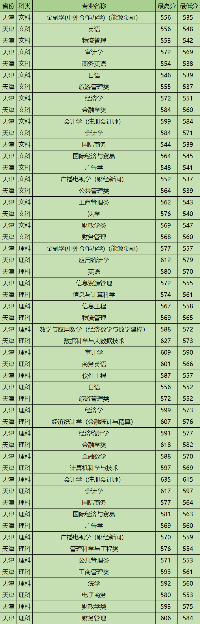 天津财经大学理科收分最高的普通类专业是会计学(注册会计师),其最高分为635分,最低分为615分;理科收分最低的普通类专业是旅游管理类,其最高分为572分,最低分为552分。