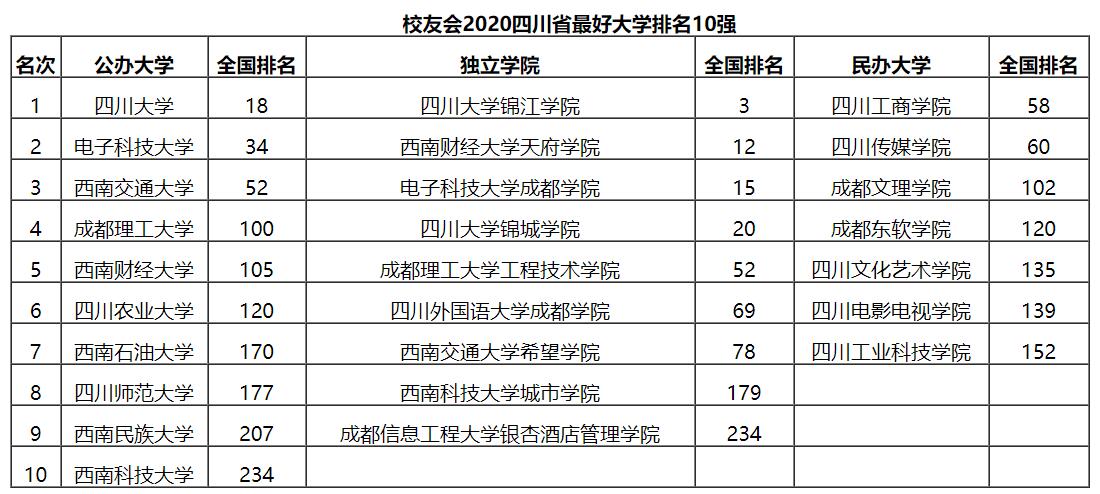 根据校友会2020年四川省最好大学排名可知: