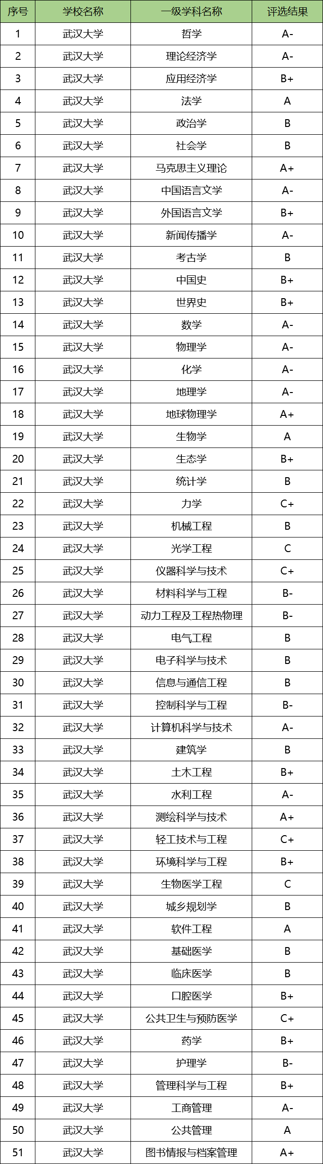 在教育部全国第四轮学科评估中,武汉大学的“马克思主义理论”、“地球物理学”、“测绘科学与技术”、“图书情报与档案管理”被评为A+的好成绩,是学校所有上榜学科中评选结果最好的学科。