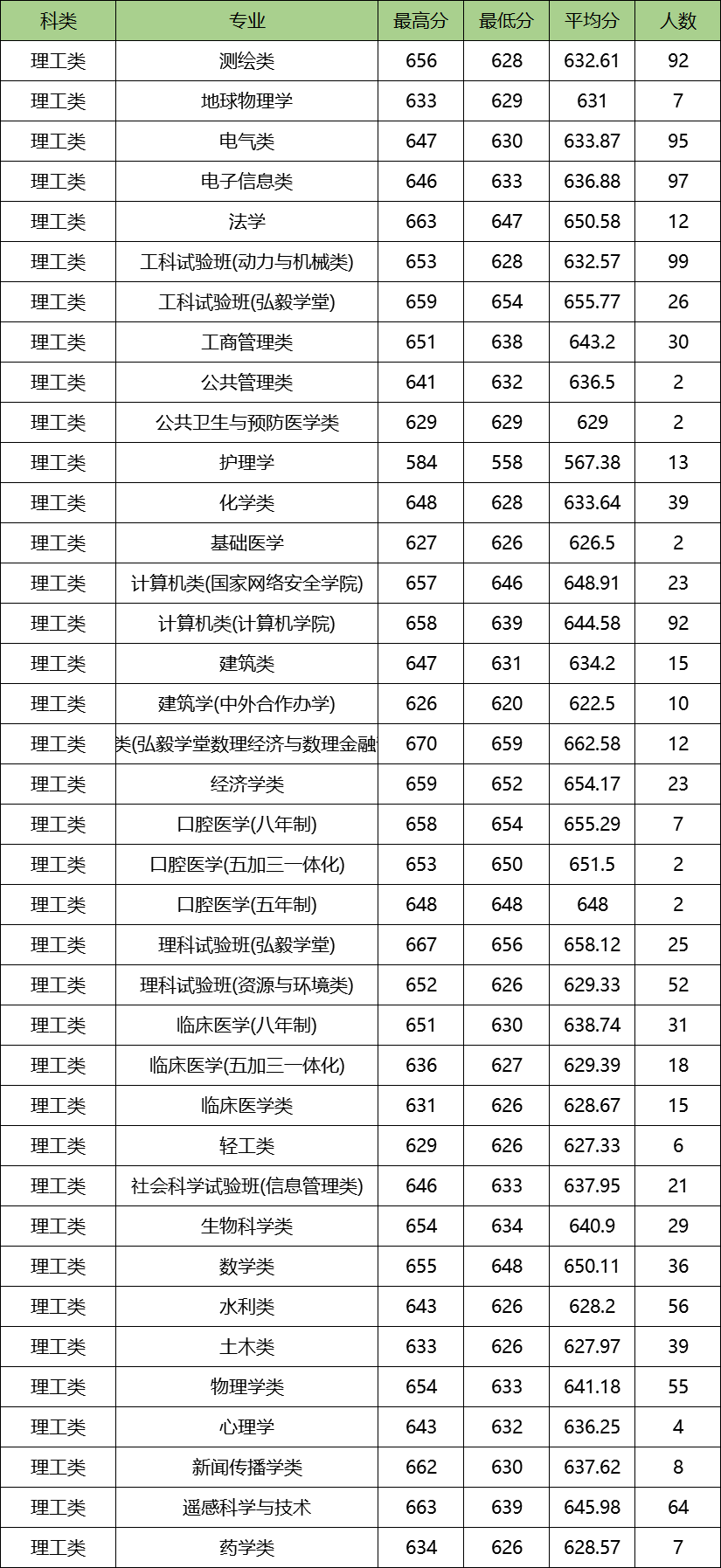 理科收分最高的是金融学类(弘毅学堂数理经济与数理金融试验班)专业,其录取的最高分为670分,最低分为659分;理科收分最低的是基础医学专业(不含护理学等单列专业及中外合作专业),其录取的最高分为627分,最低分为626分。