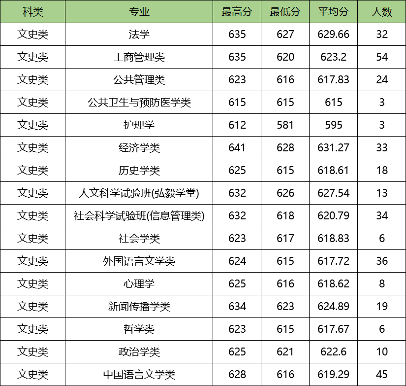 其中,文科收分最高的是经济学类专业,其录取的最高分为641分,最低分为628分;文科收分最低的是公共卫生与预防医学类专业(不含护理学等单列专业),其录取的最高分最低分均为615分。