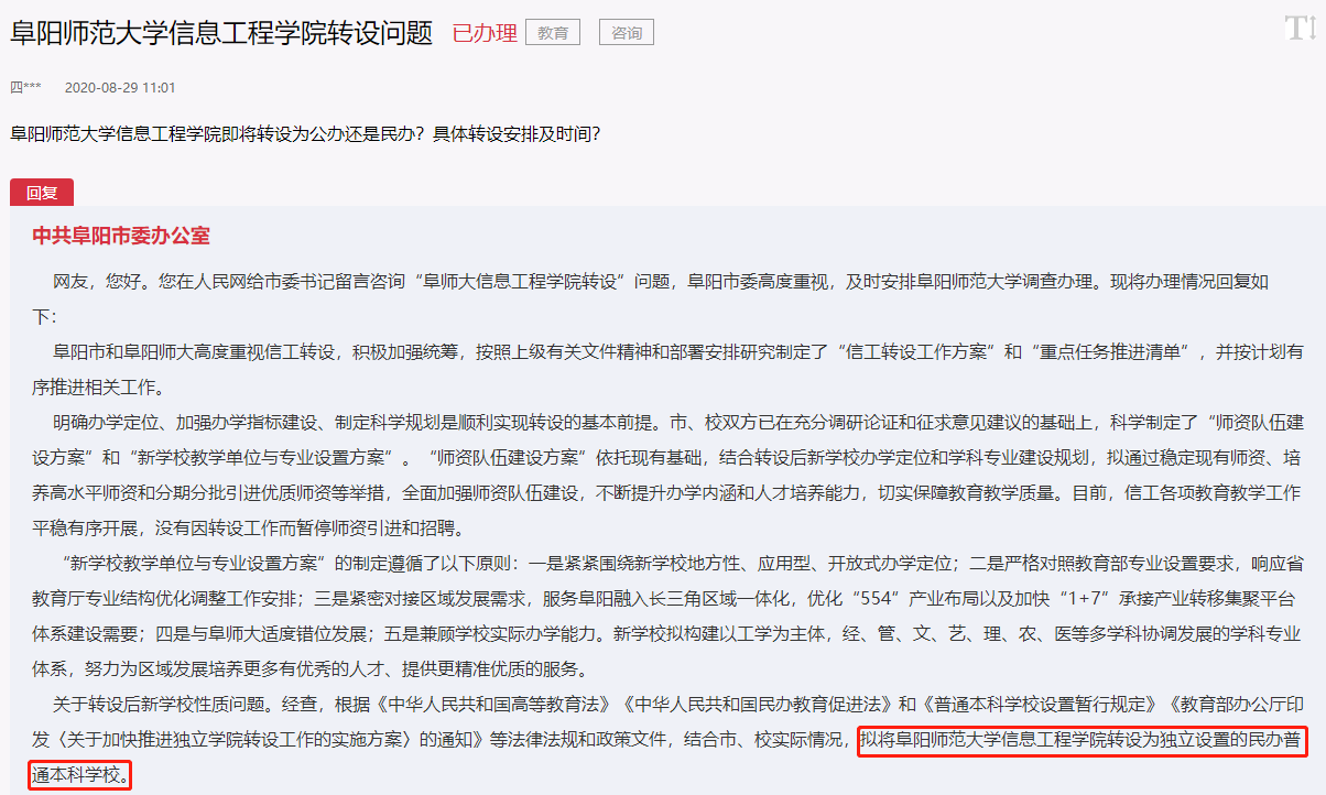 2020年9月,有网友在人民网领导留言板提问,关于安徽省的阜阳师范大学信息工程学院转设问题,阜阳市委办公室回复称,拟将阜阳师范大学信息工程学院转设为独立设置的民办普通本科学校,经阜阳市和阜阳师范大学共同协商,初步拟定于2021年底或2022年初正式向教育部申请转设。