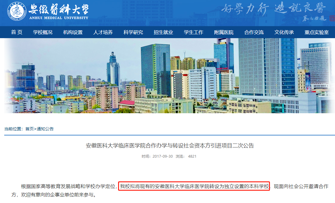 2019年10月中国新华教育集团有限公司发布公告,宣布以人民币2.27亿元购入安徽省合肥市一处地块,用于建立安徽医科大学临床医学院新校区。也就是说该校只能转设为民办院校。