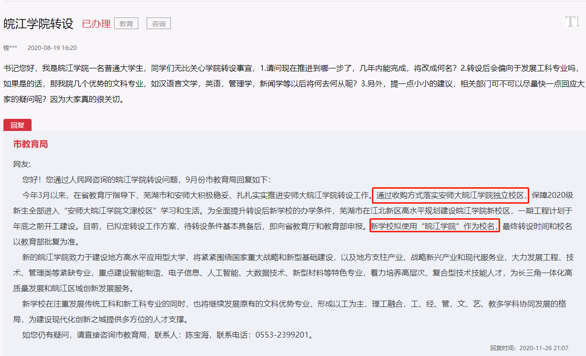 2020年8月,有网友在人民网领导留言板上就“皖江学院转设”的问题发起咨询,随后安徽省芜湖市教育局作出回应称,安徽师范大学皖江学院拟由市属国有企业作为安师大皖江学院新的承接方,通过收购的方式落实安师大皖江学院的独立校区。新学校拟使用“皖江学院”名称,按照民办非营利机制办学。