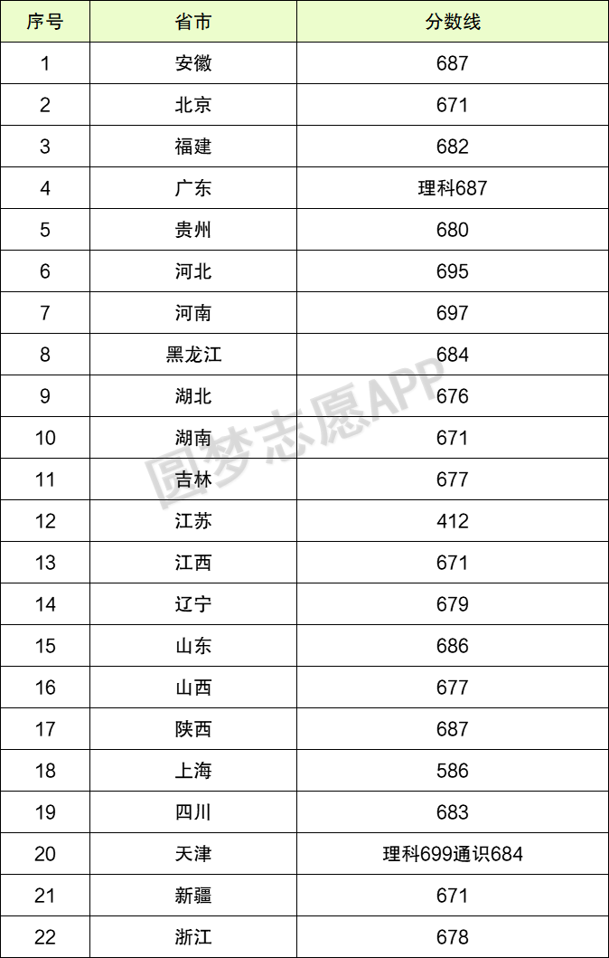 从下表可知,2020年清华大学强基计划校测入围分数线在各省份的差异并不是特别大。其中,江苏省的校测入围分数线最低,分数线为412分;其次是上海入围分数线为586分。
