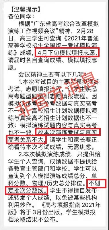 目前,广东省教育考试院暂未正式公布新高考适应性考试分数线及模拟志愿的相关消息。据学生投稿,广东可能在4月下旬安排模拟填报志愿,并且将不划定批次分数线(仅供参考,大家密切留意广东省教育考试院最新消息)。
