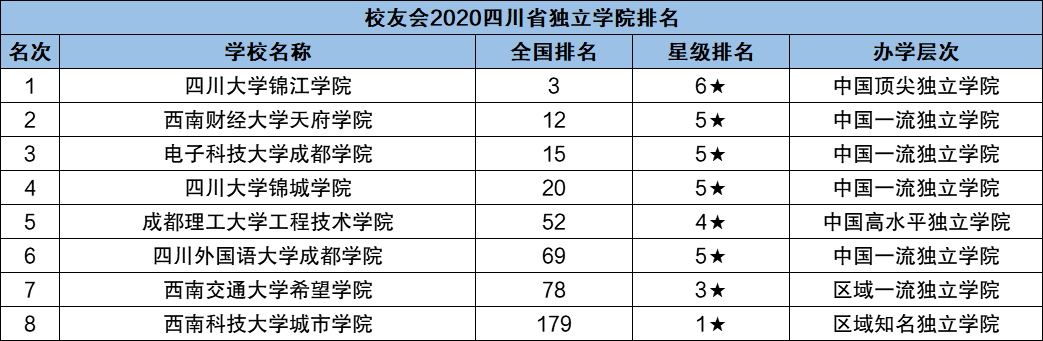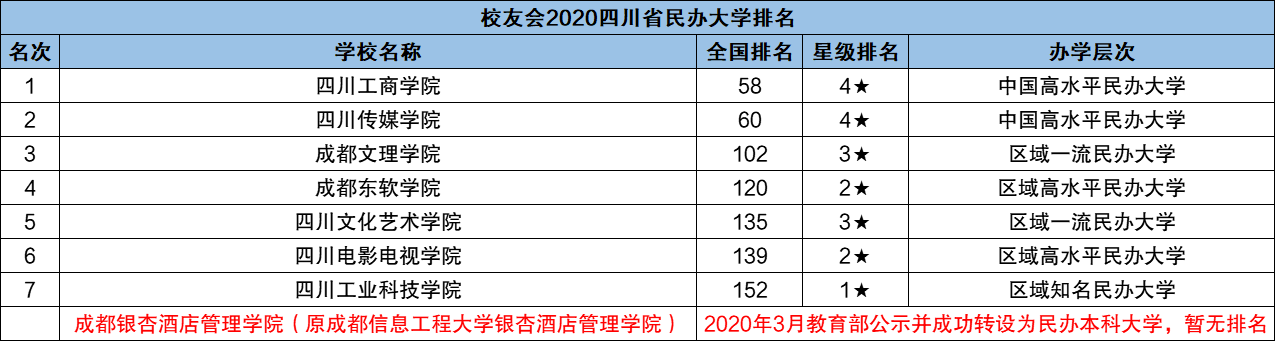 根据校友会2020年四川省民办大学及独立学院排名榜,四川民办高校省内及全国排名情况如下: