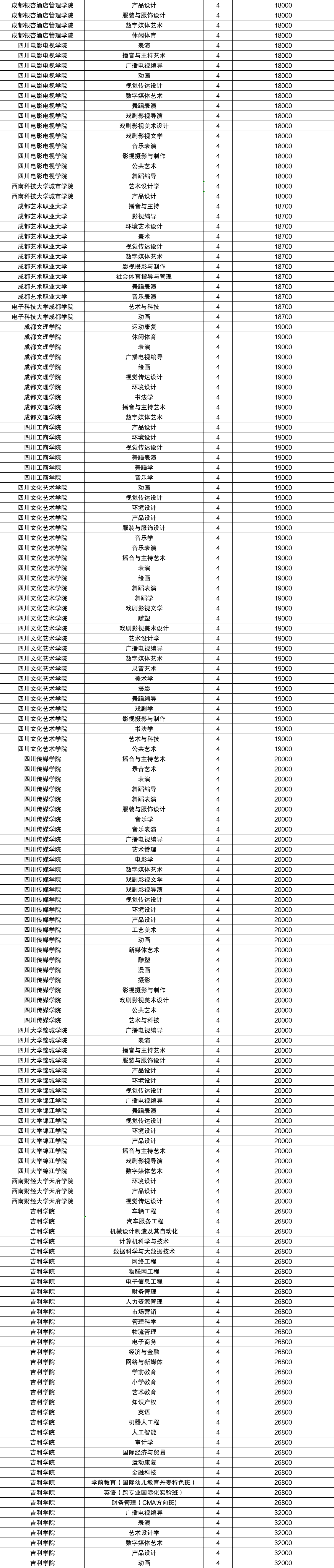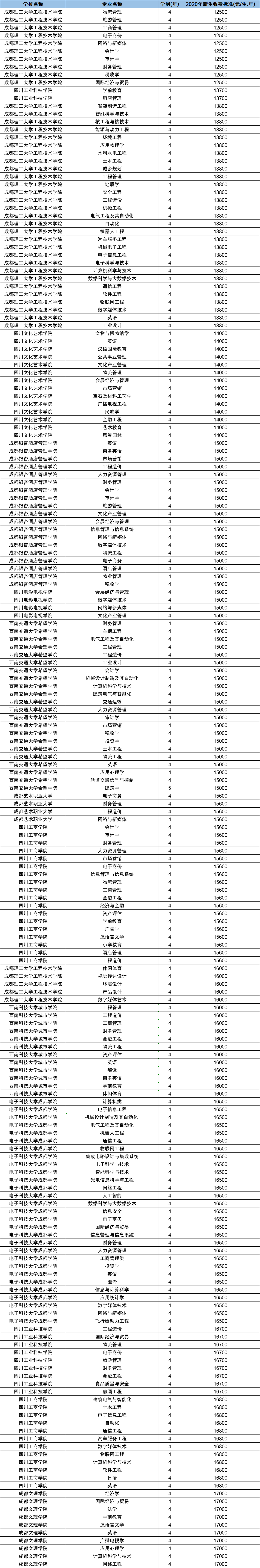 除了录取分数线和实力排名,民办大学的学费也是各位考生和家长们关心的重点。根据四川省政府2020年7月27日发布的《2020年四川省民办高校学费收费标准公示》,我们为大家整理出了以上18所民办大学各本科专业的学费排行榜,供填报志愿的考生们参考。