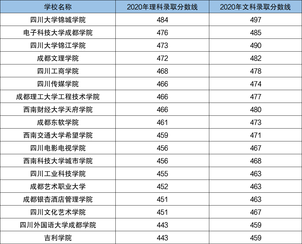 在独立学院中,四川大学锦城学院、电子科技大学成都学院、四川大学锦江学院是录取分数线最高的3所独立学院,这些学校在独立学院中实力比较突出,报考热度也不低。
