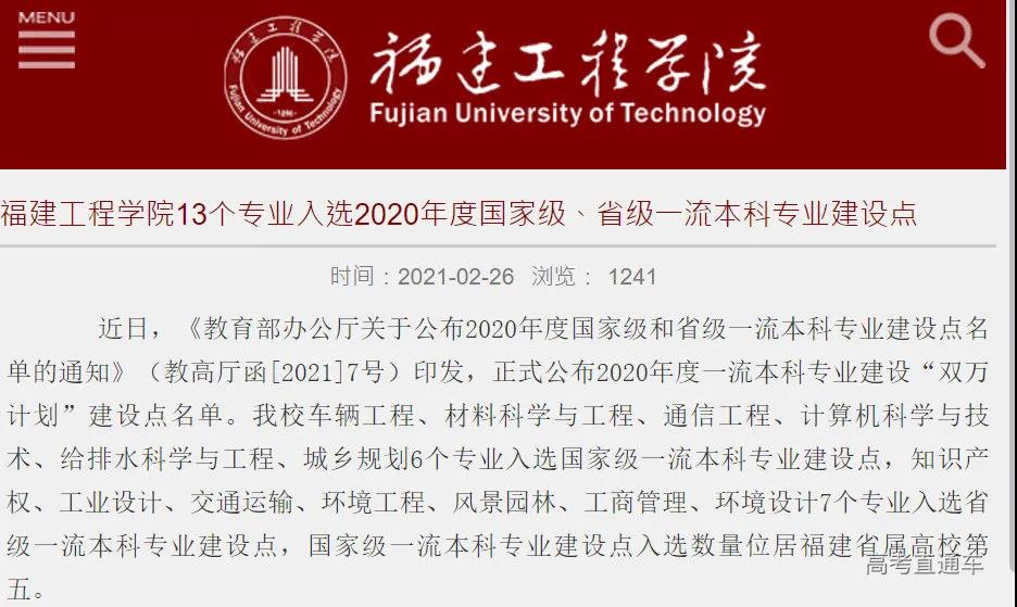 福建工程学院车辆工程、材料科学与工程、通信工程、计算机科学与技术、给排水科学与工程、城乡规划6个专业入选国家级一流本科专业建设点,知识产权、工业设计、交通运输、环境工程、风景园林、工商管理、环境设计7个专业入选省级一流本科专业建设点,国家级一流本科专业建设点入选数量位居福建省属高校第五。