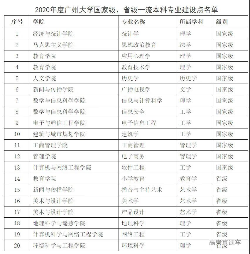 广州大学统计学等13个专业入选2020年度国家级一流本科专业建设点,小学教育等7个专业入选省级一流本科专业建设点。