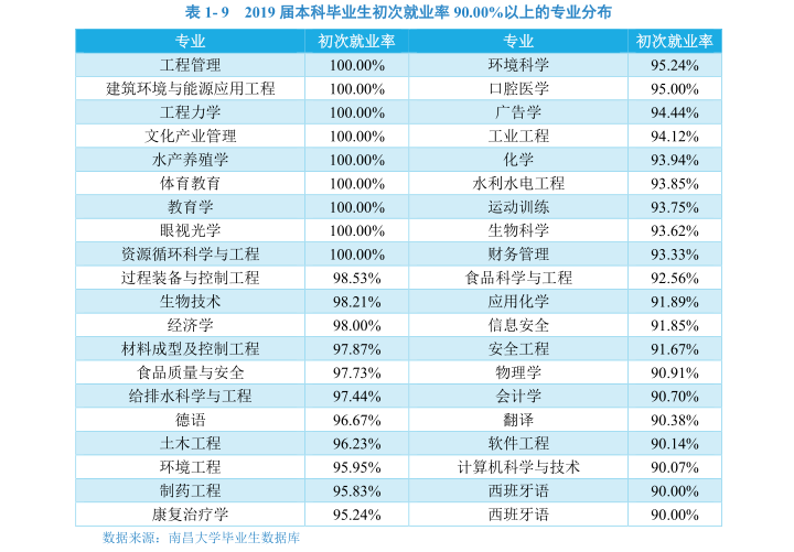 从各专业就业情况来看,南昌大学共有40个专业的本科生就业率超过了90%,22个专业就业率超过了95%。根据就业质量报告,我们为大家整理了南昌大学就业率高的专业名单,具体如下: