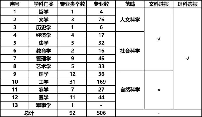 在目前我国高等教育本科的13个学科门类,92个专业大类(一级学科),506种专业(二级学科)。就从学科门类上来看:哲学、经济学、法学、教育学、文学、历史学、管理学、艺术学、理学、工学、农学、医学、军事学等。