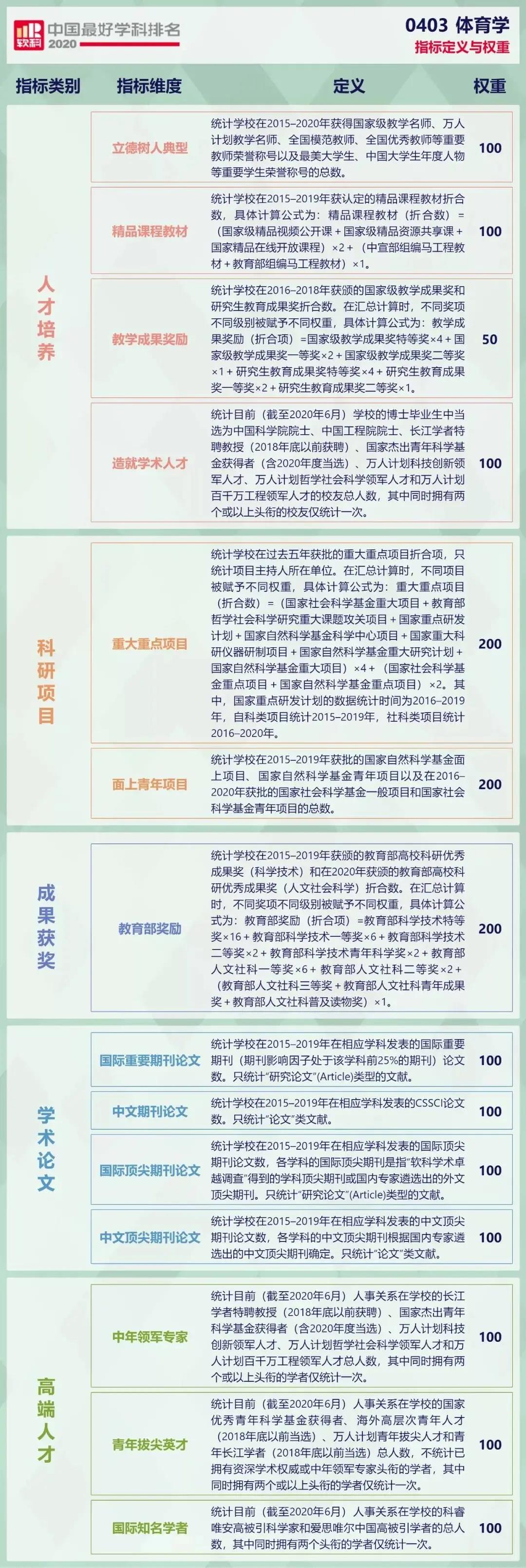 体育学学科的指标定义与权重