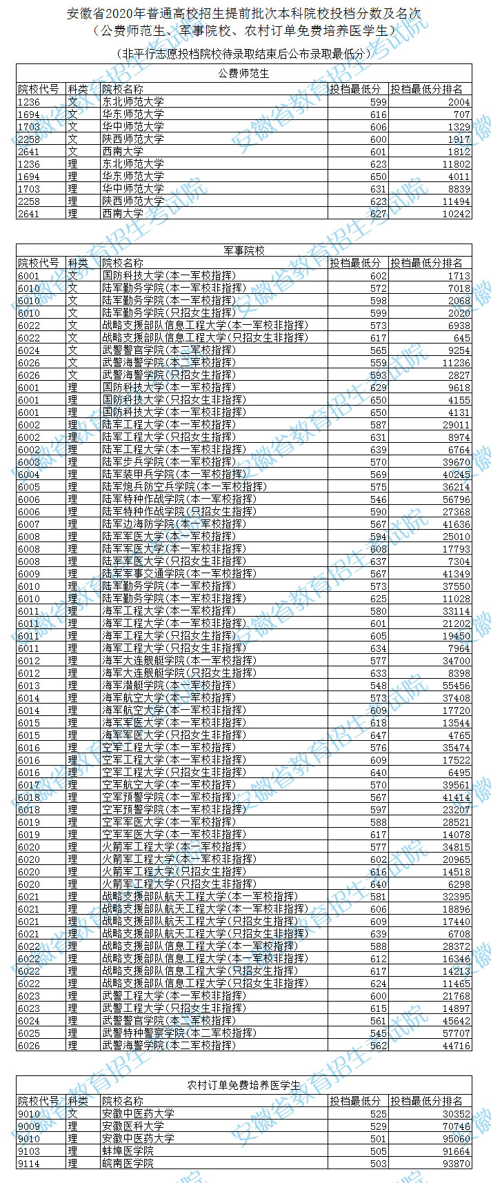 六所师范大学分别为:北京师范大学、华东师范大学、华中师范大学、东北师范大学、陕西师范大学、西南大学。下方为2020年国家公费师范生院校在安徽省的最低录取分数线,含文科和理科。