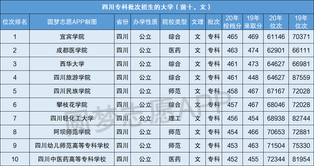 四川省专科批次招生大学2020年最好位次排名前十(文)