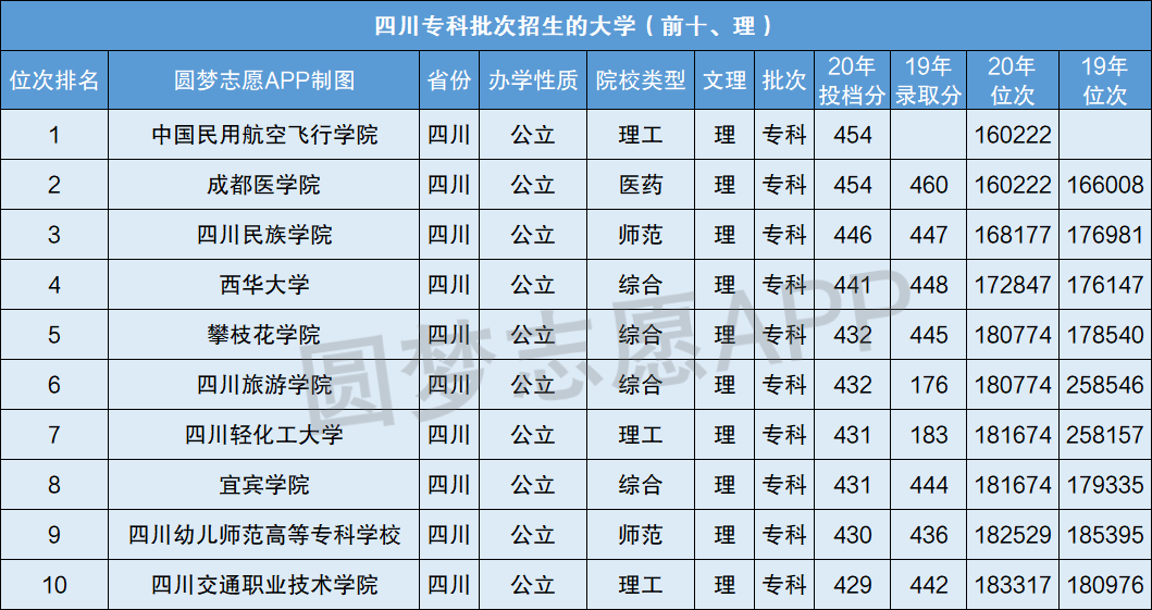四川省专科批次招生大学2020年最好位次排名前十(理)