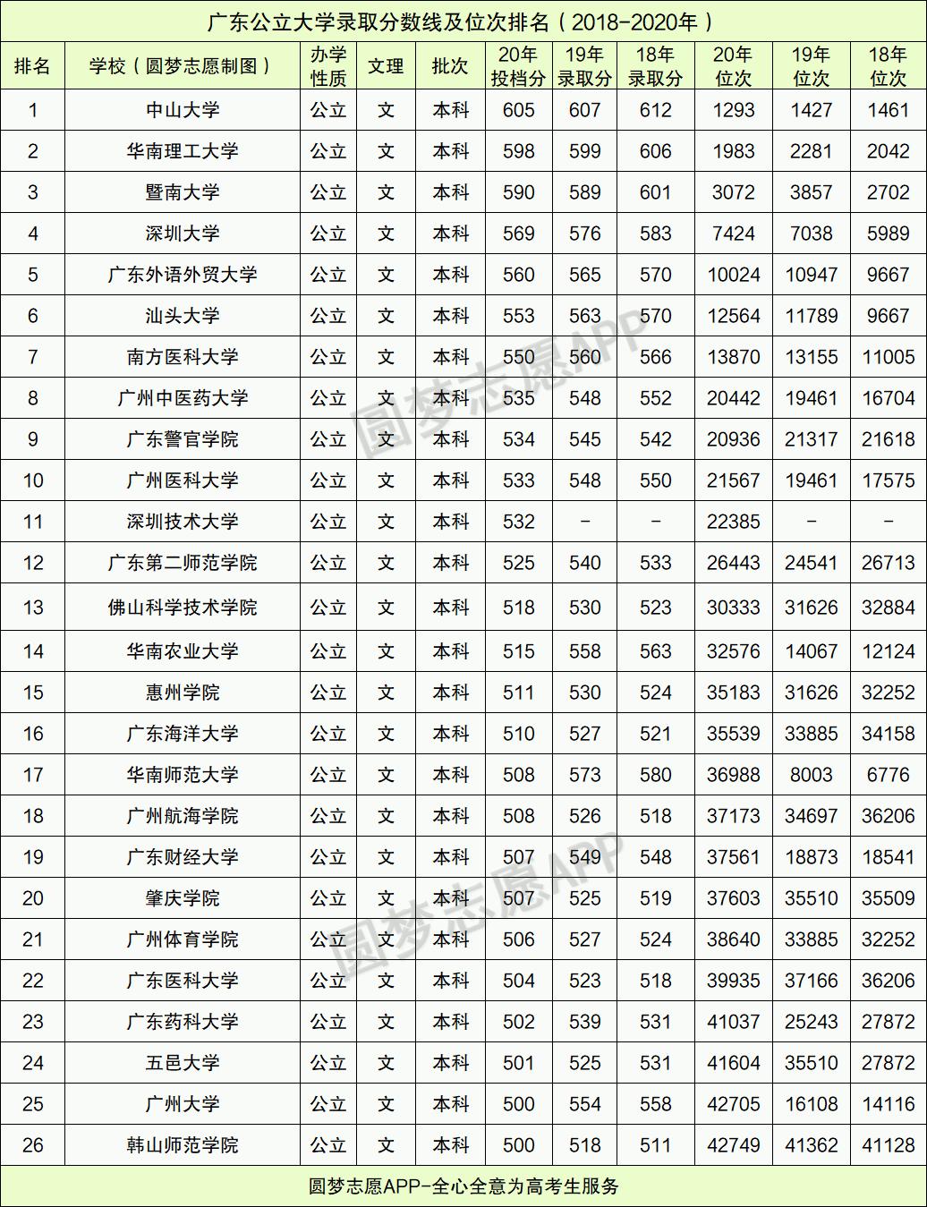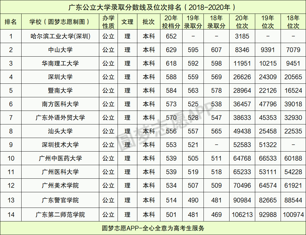 根据广东省教育考试院公布的数据,小编将广东省内的本科公立大学按照2020年投档分在500分以上及位次的高低排序,得出的排名如下:
