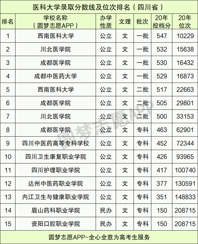 二批收分最低的院校是:川北医学院,2020年投档分为500分,位次排名33153。