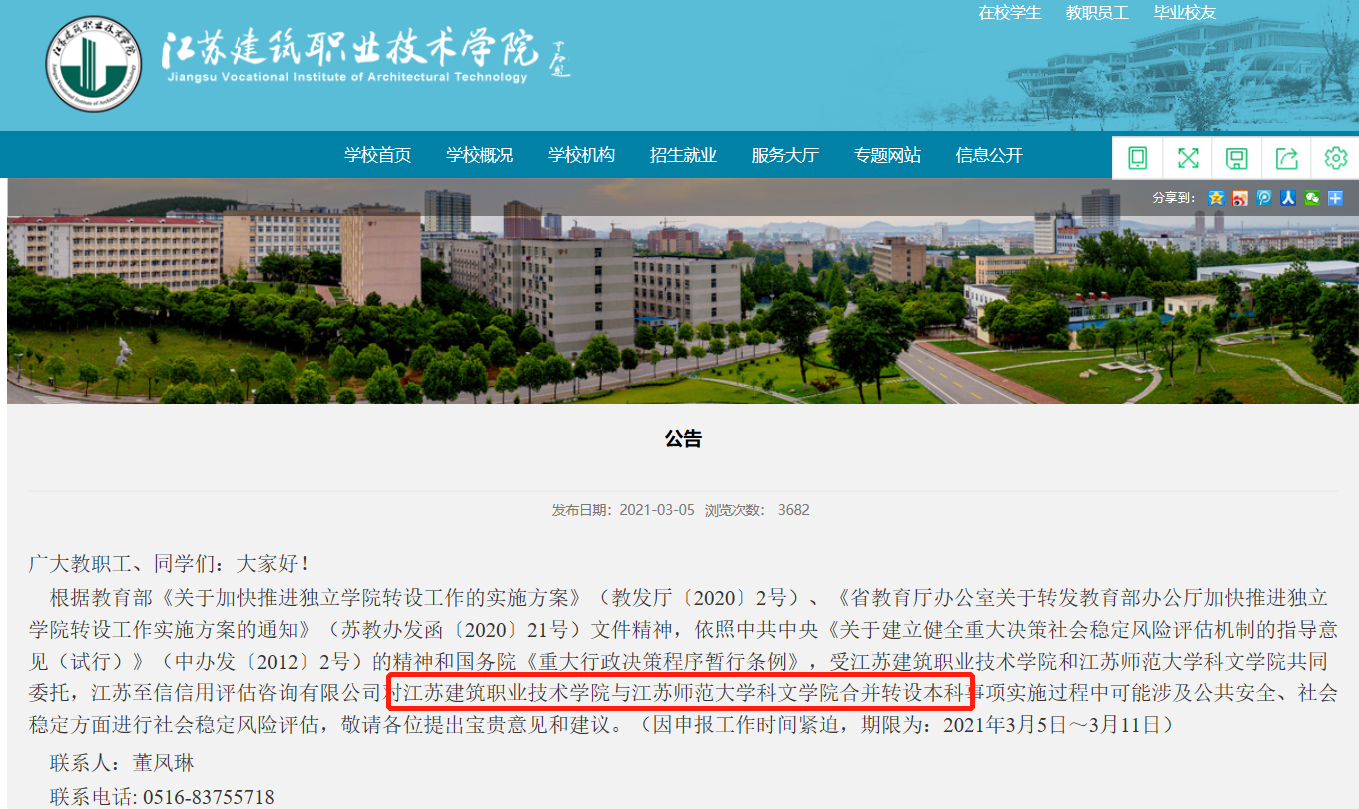 2021年3月5号,江苏建筑职业技术学院官网发布了一则公告,主要内容提到了江苏建筑职业技术学院与江苏师范大学科文学院合并转设本科事项。