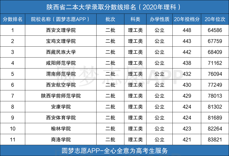 以上便是关于陕西省内的所有二本公立大学的录取分数线排名情况。如果你还想查阅全国所有大学在陕西省内的三年录取分数线及位次,可以在手机应用市场下载圆梦志愿APP,直接获取招录数据。
