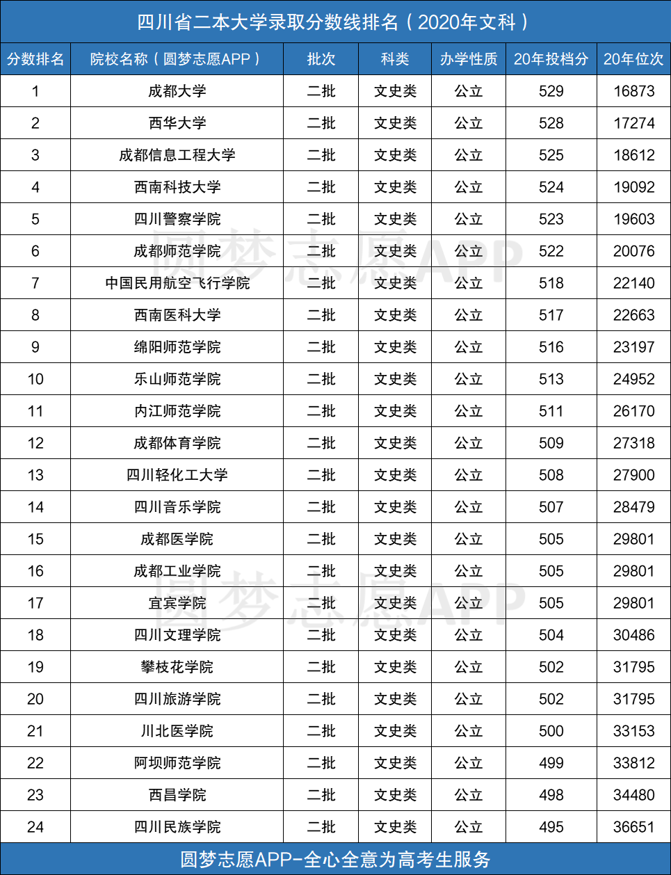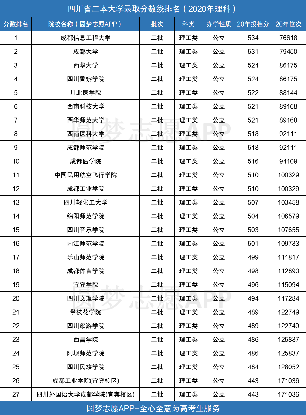 以上便是关于四川省内的所有二本公立大学的录取分数线排名情况。如果你还想查阅全国所有大学在四川省内的三年录取分数线及位次,可以在手机应用市场下载圆梦志愿APP,直接获取招录数据。